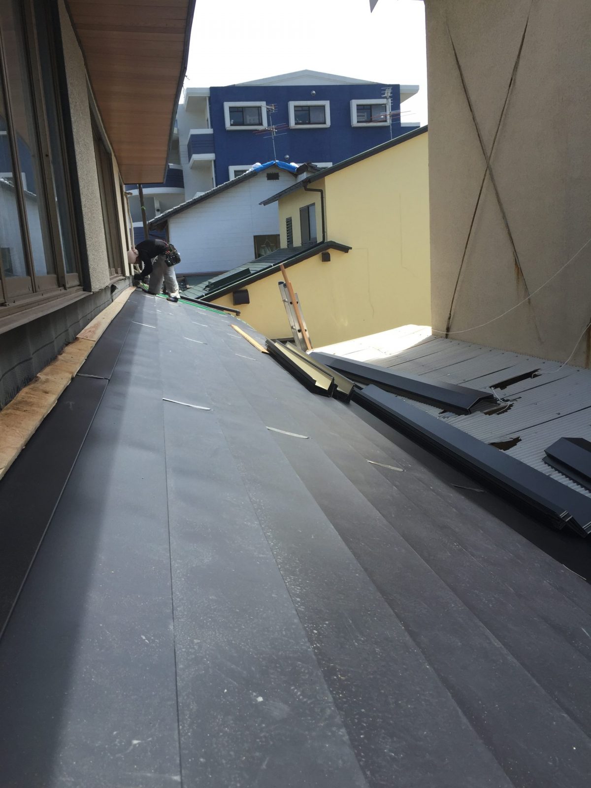 葺き替え工事は、古い屋根材を取り外し、下地の検査や補修を行います。