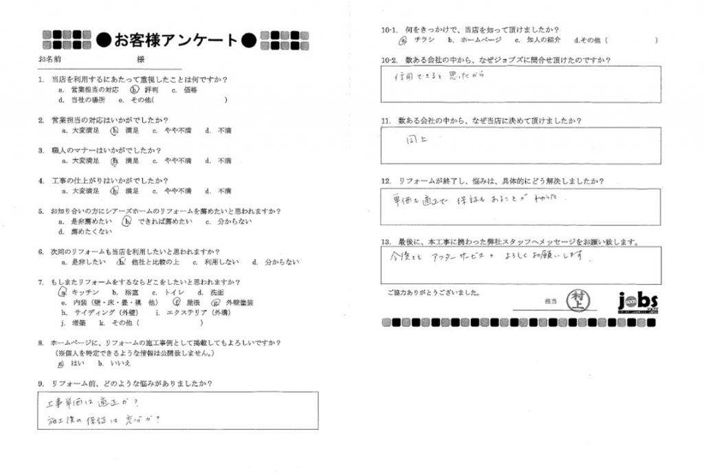 リフォームをし、単価も適正で保証もあることが分かりました。今後ともアフターサービスを宜しくお願いします。